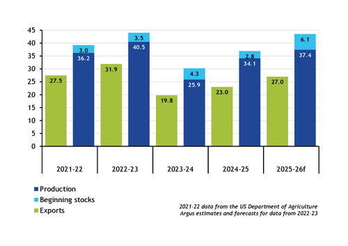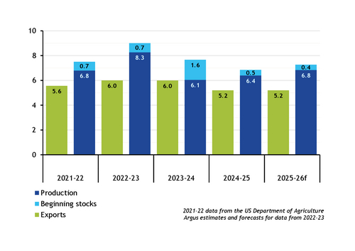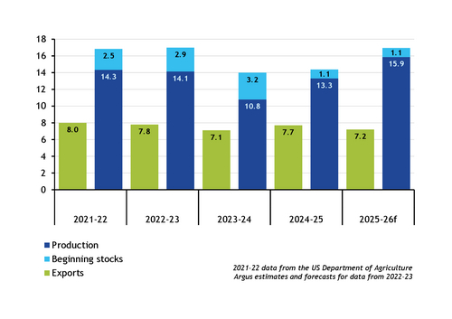Despite higher output in Russia in 2025-26 than last season, Russian exports so far have lagged significantly behind last year's pace, according to Argus estimates.
