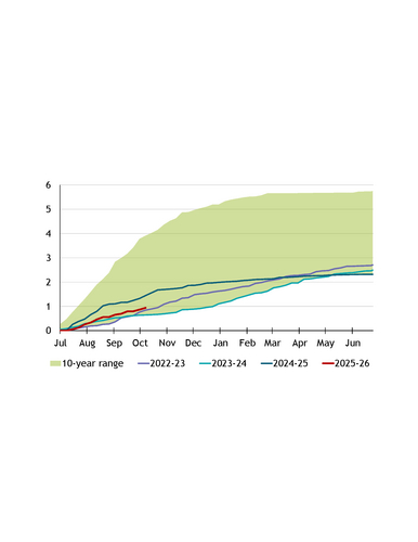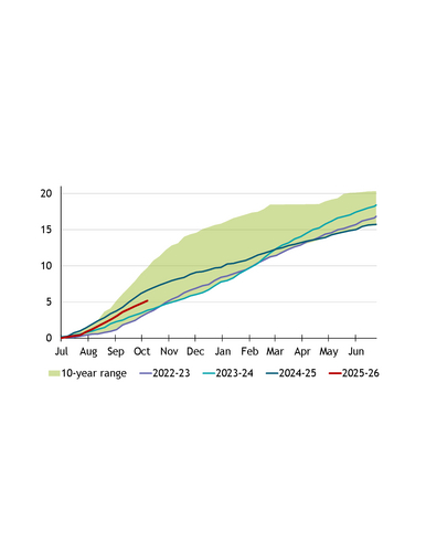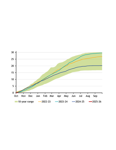 Ukrainian exporters shipped 93,000t of corn in the reporting week, bringing overall exports from the start of the 2025-26 season on 1 October to 125,000t. This is the lowest exports for this period since 2021-22 (see corn chart). Ukraine's corn exports are likely to fall significantly in October compared with a year earlier because of harvest delays. Ukrainian farmers had harvested only 3.5mn t of corn from 638,000 hectares (6,380km²) by 9 October, compared with 10.6mn t from 1.96mn ha a year earlier.