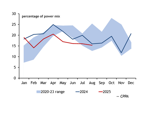 But competition with cheaper alternative fuels has weighed on LNG use for power generation this year so far, with RLNG accounting for 17pc of total power output in January-August compared with an average of about 20pc over 2020-23, Pakistan's state-owned Central Power Purchasing Agency says (see graph). RLNG has fallen in Pakistan's power grid merit order this year, government data show, encouraging more use of coal-fired plants and renewable power sources in place of RLNG, market participants say. That said, bottlenecks in north-south transmission lines can force more expensive plants to run before cheaper ones, energy minister Awais Leghari said last year. And high levels of contractualLNG imports force power producers to run RLNG-fired plants even when they are less profitable. The higher fuel costs are eventually passed on to consumers, Leghari said.