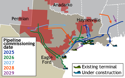 But production in the Haynesville and Permian basins may be able to grow faster than current forecasts suggest, if infrastructure bottlenecks are removed. A growing network of pipelines is advancing in states with industry-friendly regulatory and permitting regimes, which could be used by Haynesville and Permian producers to ship their supply to the Gulf coast.