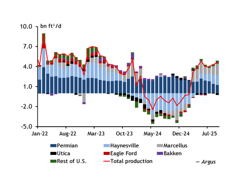 Crude economics last year resulted in Permian gas flooding the regional market faster than new pipeline capacity could enter service. In contrast, Haynesville producers had to rein in output last year and into 2025 in response to oversupply in the US gas market that brought Henry Hub prices below their breakeven.