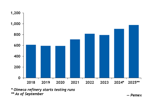 The government has also poured billions of dollars into the new 340,000 b/d Olmeca refinery and continues to prioritize increasing crude throughput at the legacy system, even as maintenance shortfalls, outages and unplanned shutdowns remain common.