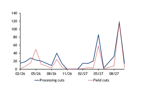 Output from new fields in 2027 coupled with high Troll production rates may help offset the decline in production from maturing assets and heavy scheduled works. One new field is set to come on line in 2026 and 10 new fields in 2027, mainly through tie-backs to existing infrastructure, NOD data show (see upcoming fields table).