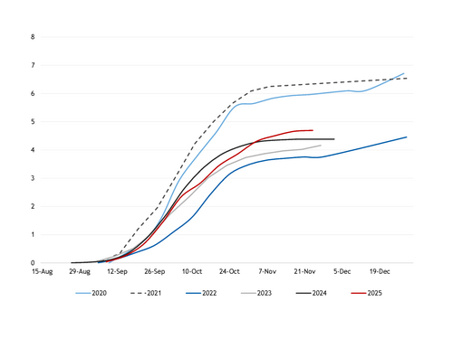 Farmers reported planting an additional 33,100ha of winter wheat in the week ending 24 November, bringing the overall planted areas for the 2026-27 season (July-June) to 4.69mn ha, or 98.4pc of the total projected 4.77mn ha. Current planted areas exceed last year's 4.38mn ha reported by 25 November 2024 by 309,000ha (see chart).