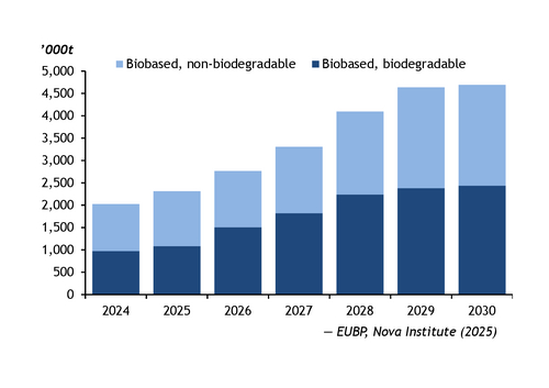 In Europe, the report expected stated that current bio-based production capacity in 2025 was 330,000 t/yr with 28.1pc of this coming from bio-PA, 30.3pc coming from PBAT, 5.2pc coming from bio-PE and 6.7pc coming from bio-PE.