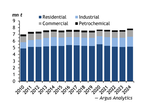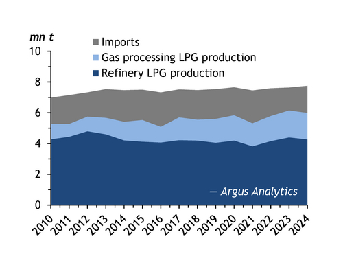 Brazil's seaborne LPG imports stood at close to 1.5mn t in January-November, down by 7.7pc on the year, according to Kpler, despite demand edging up by 1.6pc to early 6.5mn t, Sindigas data show. This may be partly owing to state-owned Petrobras boosting output in Rio de Janeiro from a new gas processing unit that opened in May and can produce about 730,000 t/yr.
