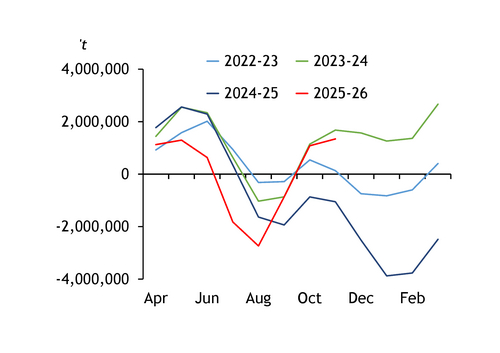 The provisional data also show that Indian urea production is holding at the rate set in October, at about 2.6mn t, and levels are generally recovering to rates previously seen in the 2024-25 fertilizer year, having averaged 2.4mn t/month in April-September this year.