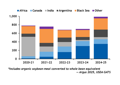 US organic soybean and soybean meal (soymeal) imports grew 68pc and 28pc, respectively, over the 2024-25 marketing year (September-August) from a year earlier, Argus data show. Imports of organic soymeal imports reached a new record while organic soybean imports were at their highest level since 2017-18.