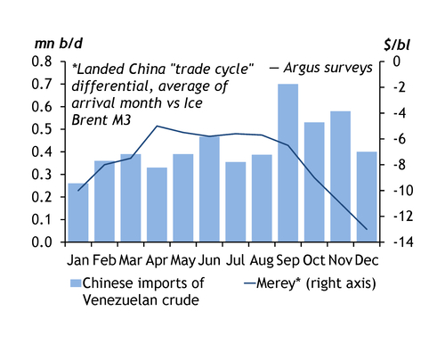 The US has seized two oil tankers off the coast of Venezuela in December. This has since led to loadings from Venezuela to China halting almost completely.