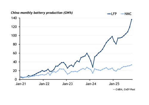 China's battery output underscores the shift. Production reached 1.29TWh in January–October, up from 843GWh a year earlier (see graph). LFP accounted for nearly 79pc of output, according to the China Automotive Industry Battery Alliance (Cabia).