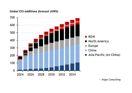 The data support this. Global ESS additions rose to an estimated 273GWh in 2025, according to Argus Consulting, and are forecast to hit 359GWh in 2026, with China alone adding 182GWh (see graph).