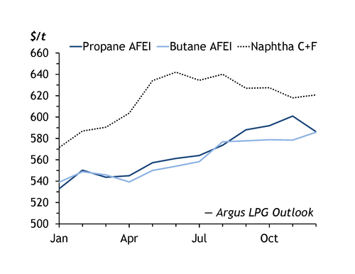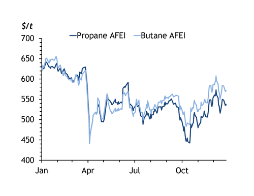 Weakness across the LPG complex kept butane AFEI prices about $38/t below naphtha equivalents from April-December, boosting demand from northeast Asian flexible crackers. Spot offers for 23,000t butane cargoes fluctuated from $40/t discounts to parity to naphtha during the nine months, underscoring butane's strength in an illiquid market. Japanese and South Korean importers are meanwhile likely to secure more butane under term contracts from the US and Australia this year, given reduced spot availability from the US and Middle East, further reducing liquidity.