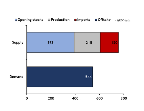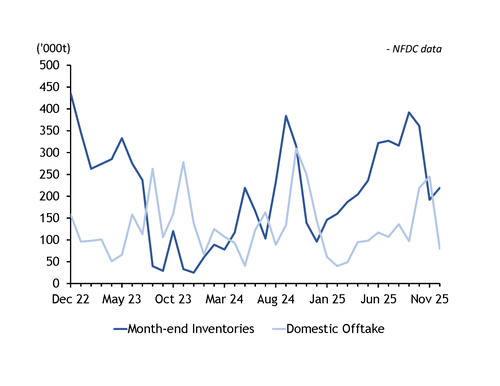NFDC estimates lower first-quarter offtake at 251,000t and 183,000t in domestic production. Pakistani DAP imports will total 111,000t in January, according to Argus line-up data. If no more imports are lined up for the first quarter, this alone could see the country's stocks rising to 262,000t by the end of the October-March rabi season.