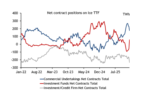 Commercial firms also increased their short exposure week on week to 1.29PWh from 1.27PWh, potentially signalling that they see a price ceiling around last week's level. That said, the report does not provide data on how positions vary across contracts, so it is impossible to know in which contracts they added shorts. Commercial firms have bigger margin requirements than investment funds because their position is backed by physical assets, meaning their stop-loss orders could be placed at a wider margin than those held by investment firms, and therefore they were not triggered by the price rally, market participants said.