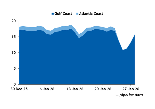 Overall feedgas nominations climbed to 15.8bn ft³ on 28 January, up from a one-year low of 10.9bn ft³ on 25 January. The preliminary flows are 2.1bn ft³ below the 30-day average through 23 January, when the storm began affecting export nominations. Flows remain subdued to Cheniere's 33mn t/yr Sabine Pass terminal in Louisiana and the 4mn t/yr Elba Island and 5.75mn t/yr Cove Point terminals on the Atlantic coast, though nominations can fluctuate later in the day.