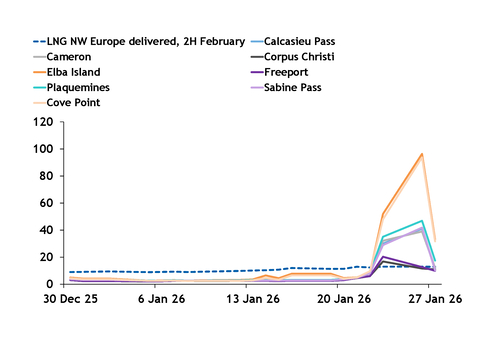 Feedgas costs to Cove Point and Elba Island have declined from record highs but stood at $31.70/mn Btu and $33.15/mn Btu, respectively, on 27 January. Both were well above delivered LNG prices in Europe in the second half of February, which were $12.88/mn Btu on the same day. A forecast for colder-than-normal weather on the US Atlantic coast through 1 February may continue to offer price support.