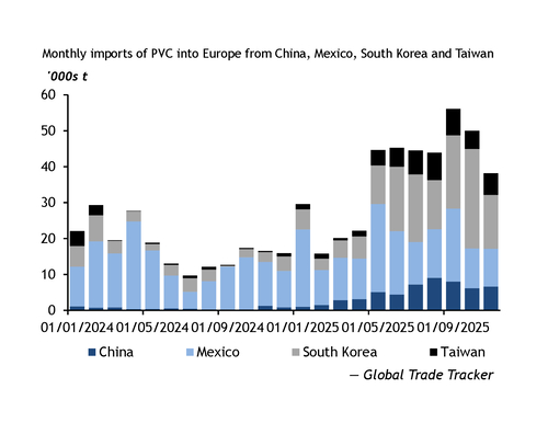 Total imports of PVC resin into Europe from China, Taiwan, Mexico and South Korea were roughly 410,300t in the first 11 months of 2025, according to Global Trade Tracker, more than double the same period a year earlier. Total imports into Europe rose to 540,000t from 469,000t in that time.