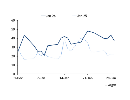Similarly, minimum temperatures in Milan are forecast to be 1.6°C above seasonal norms for the first three weeks of March, possibly limiting some heating demand. And rainfall in Malpensa is expected to be 1.3 mm/d above averages over the same period, likely contributing to national reserves, which are currently at a large deficit to the norm. Clean spark spreads for 55pc-efficient units for March were last assessed by Argus at €21.65/MWh, slightly up on the year.