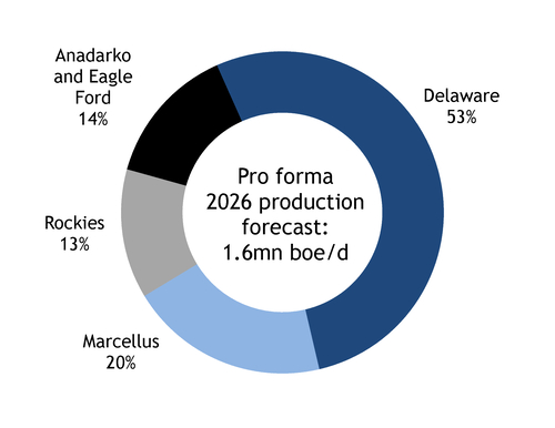 The deal creates one of the top shale producers, with more than 1.6mn b/d of oil equivalent of output as well as around 750,000 net acres (30,0000 hectares) in the core of the Delaware. "This vast leasehold position provides us tremendous operational flexibility and immediate opportunities to drive down well costs and refine capital allocation," Gaspar says. The Delaware will account for more than half of production and cash flow at the new firm, with over 10 years of top-tier inventory, including the largest amount of sub-$40/bl inventory in the sector.