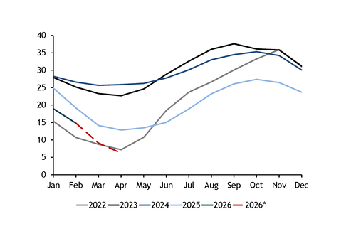 Such a low starting point would sharply increase summer injection needs. Slovakia would need to more than double its injection pace compared with summer 2025, requiring about 26.6TWh of cumulative injections in April-September, roughly 12.7TWh more than last summer to reach a storage level of 33TWh by 1 October — the three-year average for the day in 2023-25.