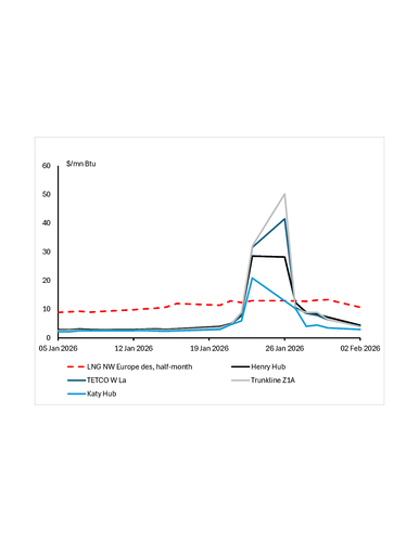 An arctic blast hit much of the US over 23-27 January, boosting heating demand while also causing freeze-offs at some gas production facilities. Gas suppliers drew on stocks to meet demand, marking the largest weekly storage withdrawal on record. But even this was not sufficient to rebalance the domestic market, and domestic spot prices soared to all-time highs. This led the US market to tap into its supply of last resort — gas intended for export. Gas producers and LNG exporters with the flexibility to do so were able to cede gas molecules back into the domestic market at attractive premiums.
