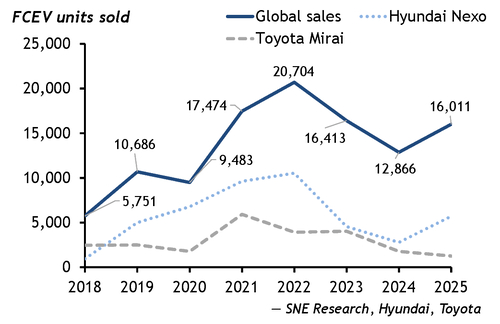 Global fuel cell electric vehicle (FCEV) sales recovered in 2025 after a weak first half of the year, returning to volumes similar to 2023 on the back of strong second half growth in South Korea and a late-year surge in China, according to South Korean intelligence firm SNE Research.
