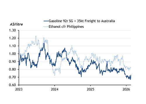 Since mid-2024, Argus price data (see graph) shows ethanol delivered to the Philippines maintained a strong premium compared to gasoline delivered to Australian east coast ports. Ethanol generally needs to be cheaper than gasoline to be commercially viable in fuel blending in the absence of a strong mandate, due to ethanol's lower energy content. Because of this, Australia's ethanol producers have been price takers, with the gasoline import price effectively setting the ceiling price. Premiums can be achieved for food-grade ethanol and ethanol's use in chemical manufacturing for items such as hand sanitiser.