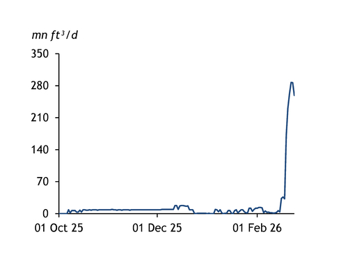 Feedgas nominations to Golden Pass have remained at elevated levels since 19 February as the terminal works to begin LNG production by early March (see chart). Flows have averaged 249mn ft³/d since then, compared with just 7.4mn ft³/d between 1 October and 18 February. Nominations for the 24-hour gas day, beginning at 10am ET on 24 February, were about 260mn ft³, although the volume may be revised throughout the day.