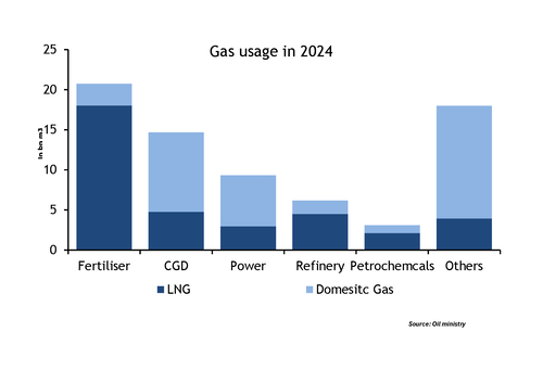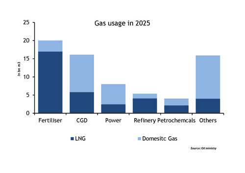 LNG is a critical component for Indian downstream industries. In 2025, LNG accounted for 80pc of gas demand from the fertiliser sector and for 36pc from city gas usage, oil ministry data show. [See graph- Gas Usage in 2025]
