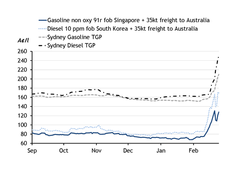 This relationship could alter slightly in the coming months. The Australian government announced on 13 March that the minimum stockholding obligation is to be reduced for each company to which it applies, to ensure extra supply of gasoil and gasoline flows to regions experiencing shortages. The release of up to 762mn litres (4.8mn bl) of gasoline and gasoil should start to enter the local market in the coming days. Those stocks were purchased at lower international price levels and when combined with cargoes arriving to Australia which were bought at higher price levels, could skew the correlation between TGP and international benchmarks.