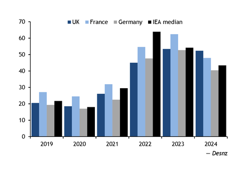 Recent closures and curtailments in some of the UK's most gas-intensive segments, including ammonia and ethylene, have resulted from higher gas prices. UK industrial natural gas prices excluding taxes rose from £20.50/MWh in 2019 to £52.30/MWh in 2024, around 20pc above the IEA median and higher than in France and Germany (see industrial gas price graph).