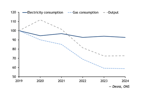 UK chemicals-sector electricity consumption was 14.7TWh in 2024, down by 7pc from 15.8TWh in 2019 before the pandemic, according to the latest data from the Department for Energy Security and Net Zero (Desnz), having fallen slowly but steadily over the period. The production for manufacture of chemicals and chemical products index fell by 27.2pc over the same period, according to data from the Office for National Statistics (ONS). This means output has fallen almost four times faster than electricity consumption, suggesting the remaining industrial base is more power-intensive (see consumption and output graph).