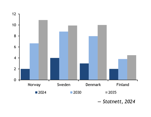Power consumption from data centres is forecast to reach 28 TWh/yr regionally by 2030 or 5pc of total demand, up from 8TWh or 2pc of demand in 2024, according to projections by Statnett. The TSO forecasts around 4 TWh/yr of consumption in Finland by 2030, doubling compared with 2024, and 8 TWh/yr in Denmark. Norwegian and Swedish data centre consumption is forecast to total 7 TWh/yr and 9 TWh/yr, respectively, by 2030 (see graph).