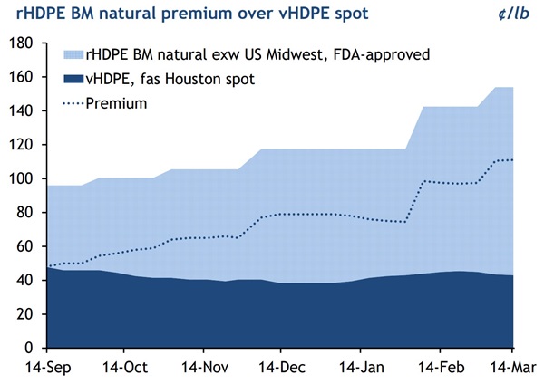 But there is a finite limit to the amount of money they will pay as a premium for sustainable packaging materials. Market participants know that there is a limit to how high HDPE natural prices can rise, and history shows a risk of prices crashing if the market becomes overinflated.