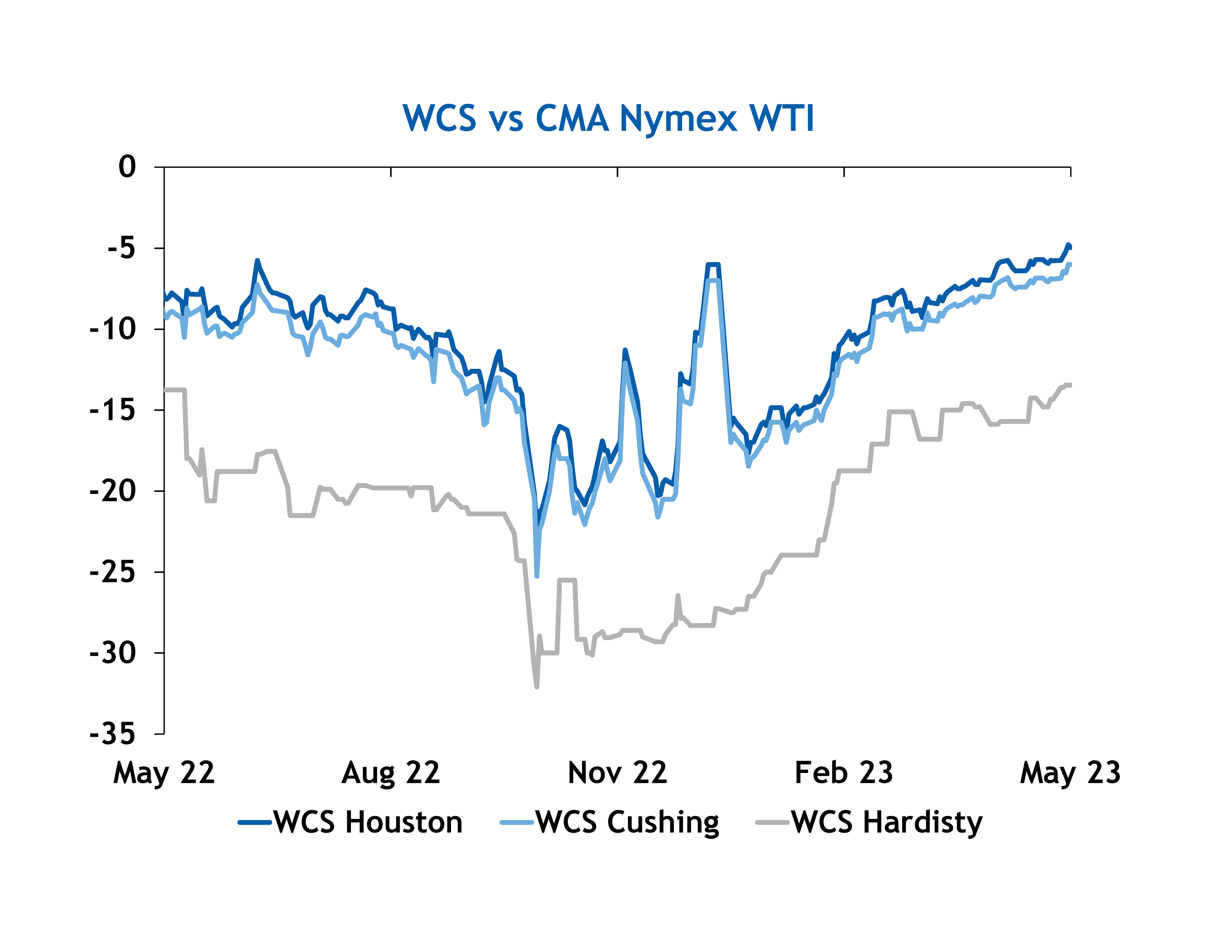 WCS Houston was assessed during the week ending 19 May at a discount narrower than $5/bl to the CMA Nymex, which serves as the basis for Canadian crude trades in both the US and Canada. That’s the slimmest since late April of last year and far off the $20-$30/bl discounts seen in October. Even more tightening may be on the horizon if the Trans Mountain Expansion (TMX) pipeline, which will give Canada’s oil sands greater access to west coast ports, meets its early 2024 completion goal.