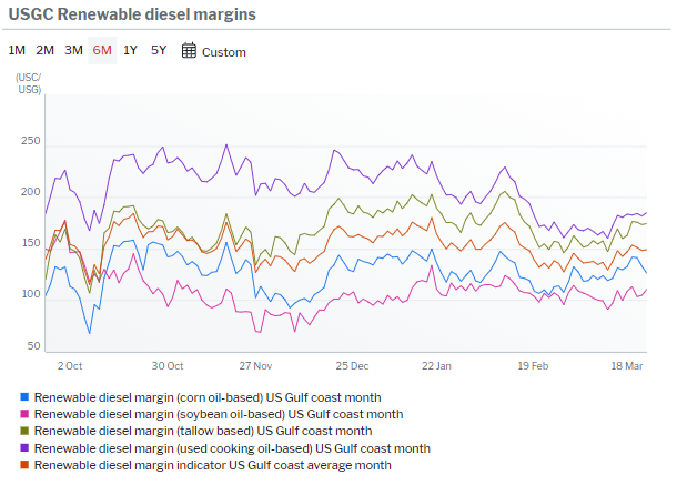 Renewable diesel margins in the US Gulf coast have recovered in recent days, after deteriorating for much of February. Average margins across all feedstocks were measured at 151.2¢/USG on 20 March, which is 10¢/USG above the March month average and 12.4¢/USG above the same day prior month.