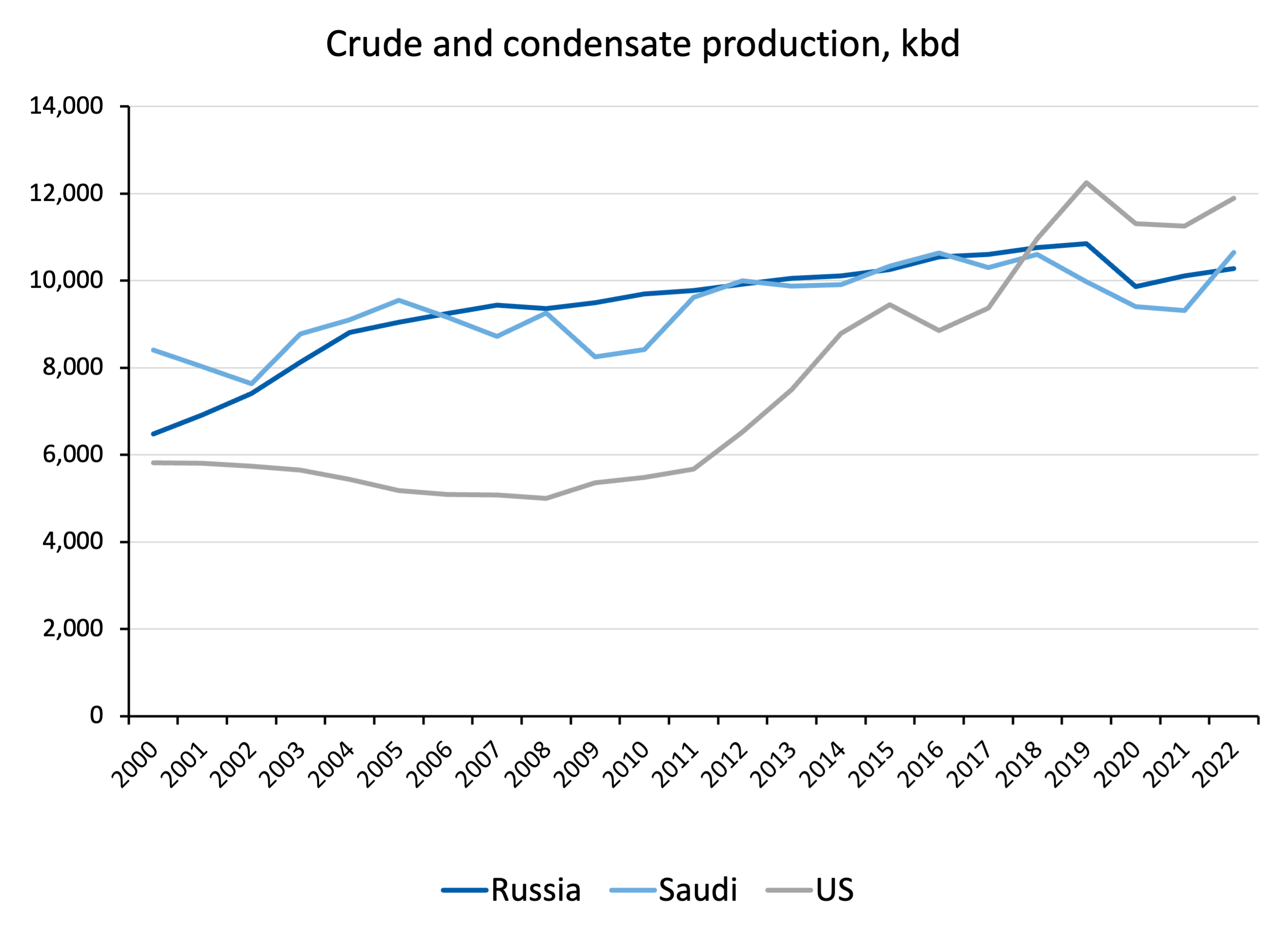 Russia vied with Saudi Arabia for the title of world’s largest crude producer from 2002 up to 2018, when both were eclipsed by the US. Russian and Saudi output decisions, both unilaterally and through the Opec+ partnership, are key to the movement of global oil prices. Currently they are both voluntarily reducing output, supporting outright prices, and unconstrained US crude is flowing into Russia’s traditional market in Europe, and Saudi Arabia’s in Asia.