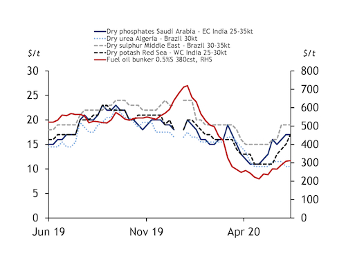 The drop in freight rates in the six weeks to the end of April broadly softened the impact on fertilizer producers' fob levels, with shipments continuing through the slowdown in overall global trade, as governments designated fertilizers a crucial component of the food supply chain.