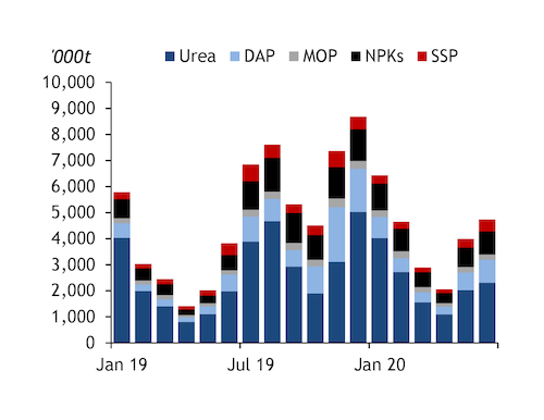 Total fertilizer sales — urea, DAP, NPKs, MOP and SSP — have already surpassed June 2019 levels this month (see chart). Sales have hit 4.74mn t as of 22 June, up from 3.84mn t in the month last year, continuing the momentum seen in May, latest government data show.