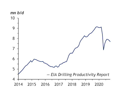 Output bounced back strongly this summer as operators unwound deep voluntary curtailments totalling more than 2mn b/d that they made in April-May. Oil production rose by 1mn b/d in June-August in the seven shale formations covered by the EIA's Drilling Productivity Report (DPR). But the DPR expects lower output in September-November as production at new wells proves insufficient to offset legacy declines at existing ones (see graph).