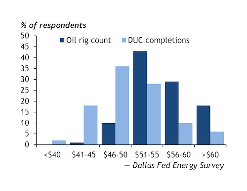 Yet $40-45/bl WTI is not high enough for shale oil output to stage a recovery. US oil rig counts are slowly rising after a dramatic plunge in March-June, but the number of active drilling rigs is still less than a third of March levels. And nearly 90pc of survey respondents say at least $50/bl is necessary for a "substantial" increase in rig counts (see graph). With prices stalled at about $40/bl, operators are cautiously drawing on their backlog of drilled-but-uncompleted (DUC) wells for new capacity. A fifth of survey respondents expect DUC completions to pick up at $40-45/bl and more than half at $50/bl.
