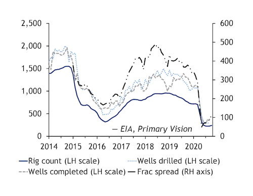 The number of active frac crews has more than doubled to about 115 from a low of 45 in mid-May, according to fracking industry monitor Primary Vision, as operators crank up completions (see graph). Yet this is barely a third of the crews operating in February-March before the pandemic struck and — crucially — less than two-thirds of the number needed to keep output flat. Primary Vision's weekly "Frac Spread Count" estimates the number of active fleets from drill site activity and hydraulic fracturing fluid and proppant pumping volumes.