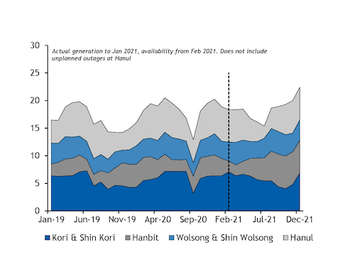 The maintenance extension at Hanbit 4 and 5 has created a 2GW shortfall in availability compared with the previous outlook, while outages at the Hanul plant will curtail a further 1.9GW for as long as they remain off line.