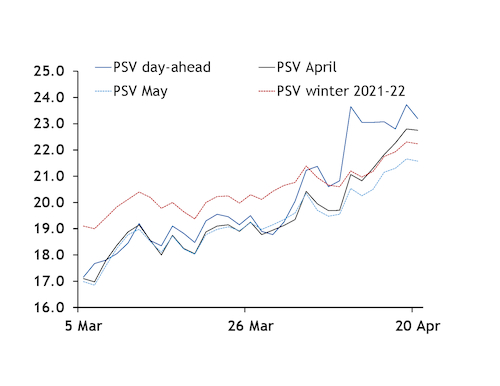 PSV prompt prices held above the winter 2021-22 price on all but one day on 7-20 April, discouraging especially quick injections.