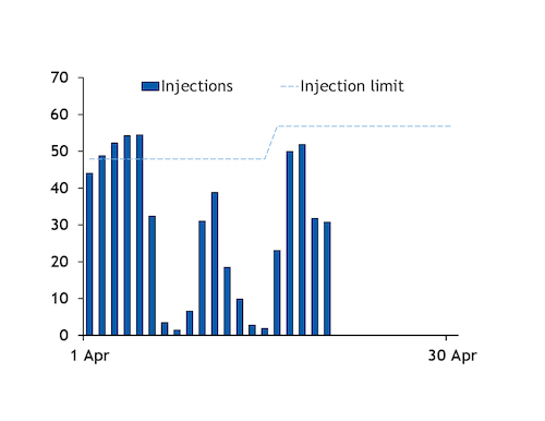 Aggregate injections stepped up to 37.5mn m³/d on 16-20 April from an average of 26.7mn m³/d on 1-15 April, as weaker consumption freed up more supply to add to storage. But injections were still well short of the three-year average for the entire month of 56.1mn m³/d (see graph). Unseasonably cool weather following low consumption over the Easter holiday period has bolstered demand this month, while power sector gas burn has also risen, leaving less supply available for injections.