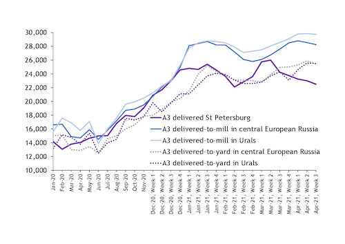 The spread between St Petersburg exporters' bids and steelmakers' domestic scrap purchase prices widened as mill prices rose to fresh multi-year highs on 1 April.