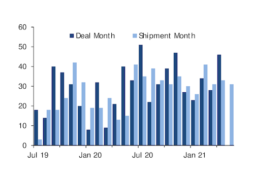The 50 cargoes purchased represent a sharp increase from the 34 deals recorded in March and 21 in April 2020. The estimate of 60 deep-sea purchases for April is 33pc up on an estimated 45 cargo purchases in March 2021.