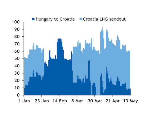Deliveries to the terminal have coincided with lower pipeline flows to Croatia from Hungary. Market participants said this may be the result of a swap arrangement involving a large Croatian supplier that holds a Russian supply contract (see graph).
