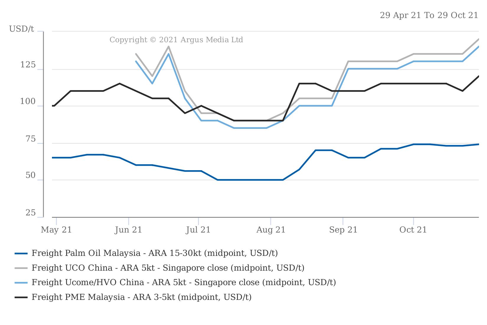 Bulk freight on used cooking oil (UCO), UCO methyl ester (Ucome) and hydrotreated vegetable oil shipping from east China to ARA have risen between 61-65pc since emerging from a trough on 30 July (see graph). Costs for shipping palm oil and palm methyl ester to the same destination from Malaysia have risen more gently, by 48pc and 37.5pc respectively, over the same period.