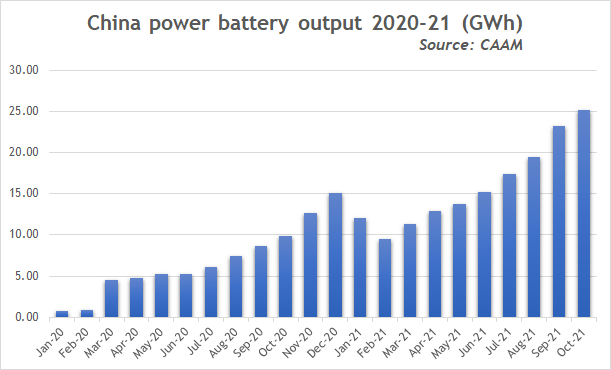 China's total output of power batteries rose to 159.8GWh during January-October, up by 250pc compared with the same period of last year, while installed volumes increased by 168.1pc to 107.5GWh over the same period, according to data from the China Automotive Manufacturers Association (CAAM). CATL, BYD and China Aviation LB were the top three battery manufacturers for installed volumes during January-October at 54.5GWh, 17.9GWh and 6.4GWh respectively, accounting for 50.7pc, 16.6pc and 6pc of the total.